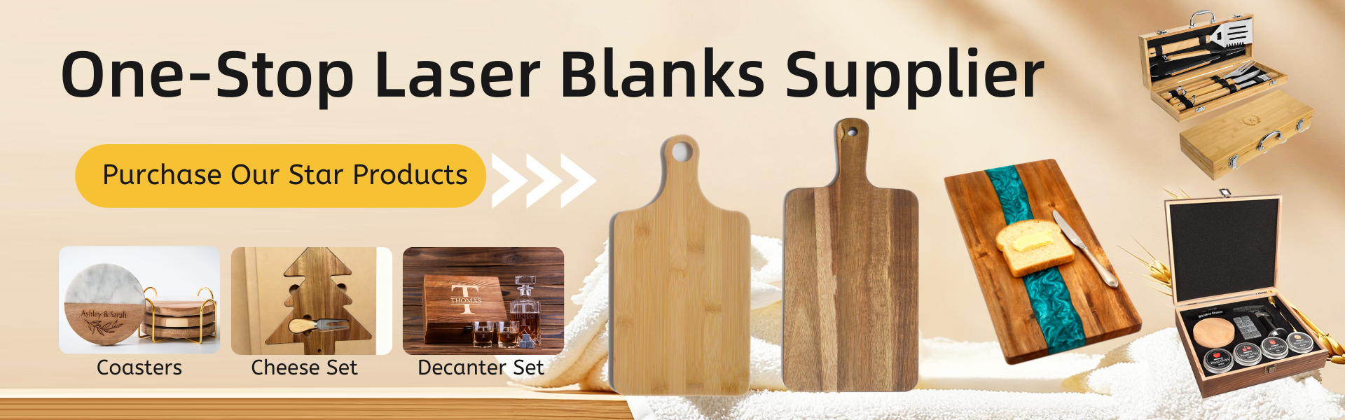 SKYJOY is dedicated to providing premium laser engrave blanks. We offer a wide range of products like cutting board, coasters, openers, keychains, whiskey decanter set, BBQ tool set, jewelry boxes. For order over $ 45.00 can provide free freight service to 48 lower states. For single item over 5 boxes we can provide 5% discount. Feel free to contact us if you have large requirements or custom requirements!