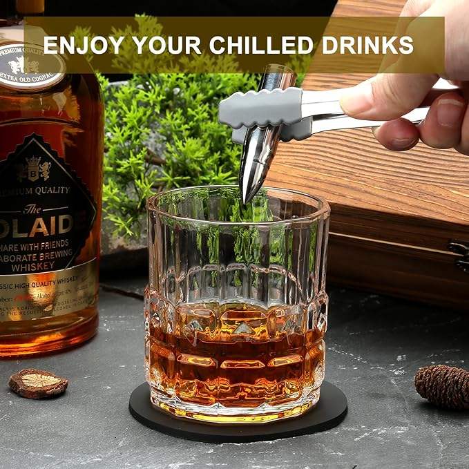 • XL CHILLING STONES – NO DILUTED DRINKS! Ditch the ice and enjoy your bourbon the way it was meant to be! Our extra-large (55mm) stainless steel chilling stones cool your drink without watering it down for a bold and smooth taste every time.